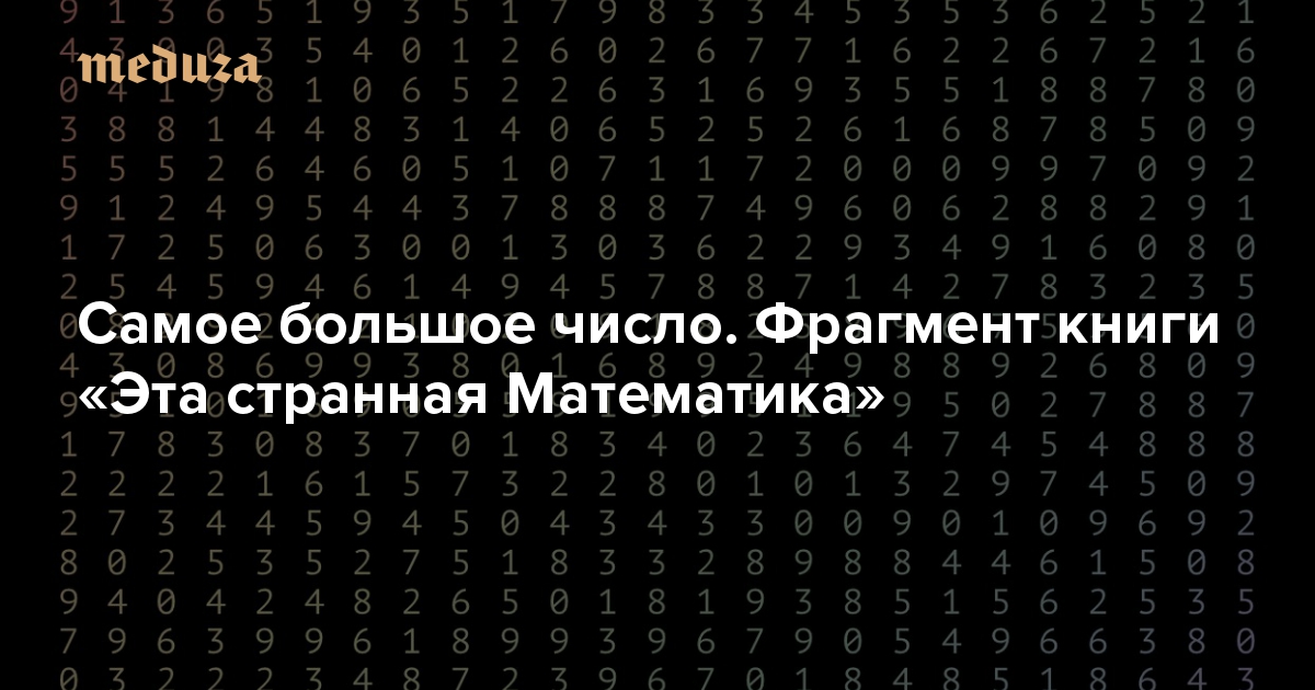 В конце февраля в издательстве Corpus выходит книга Дэвида Дарлинга и Агниджо Банерджи «Эта странная Математика — на краю бесконечности и за ним» (перевод Алексея Глущенко). Это популярное введение в самые современные проблемы из очень разных разделов этой гуманитарной (по убеждению В. Успенского) науки: от теории чисел до топологии, от алгоритмов до теории игр. Каждую из этих проблем авторы описывают с самого начала, абсолютно понятно и доступно даже ребенку. Но буквально за несколько первых страниц читатель не только знакомится с историей вопроса, но и успевает подняться на довольно высокий уровень абстракции, с которого можно хорошо рассмотреть пусть и не сами современные проблемы, но контекст, в котором они находятся. «Медуза» публикует фрагмент главы, где такой подход авторов наиболее очевиден: она о том, как математики на протяжении тысячелетий придумывали все более и более головокружительные числа.