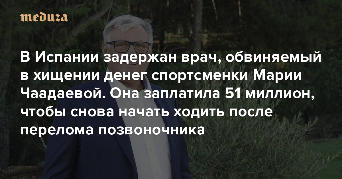 В Испании задержан врач, обвиняемый в хищении денег спортсменки Марии Чаадаевой Она заплатила 51 миллион рублей, чтобы снова начать ходить после перелома позвоночника. Врач знал, что это невозможно