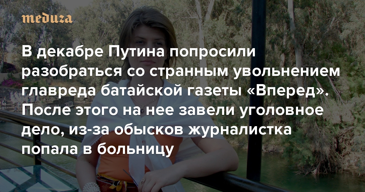В декабре Путина попросили разобраться со странным увольнением главреда батайской газеты «Вперед». После этого на нее завели уголовное дело, из-за обысков журналистка попала в больницу