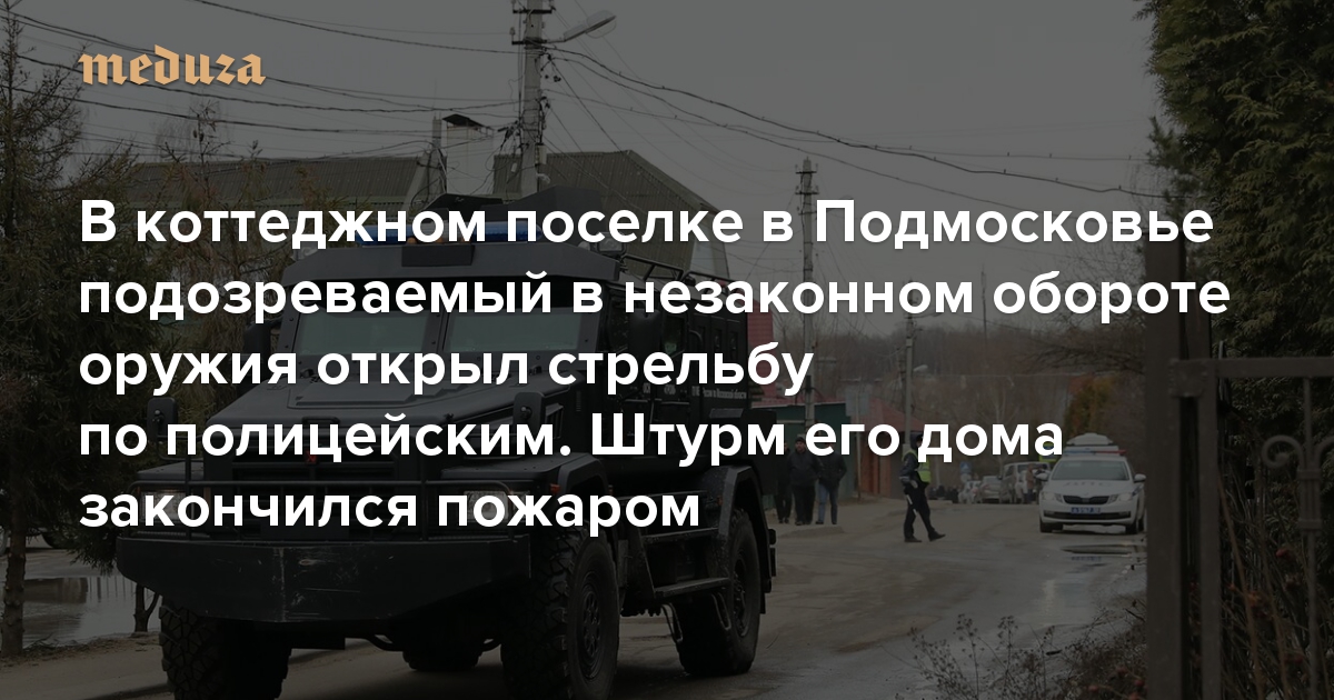 В коттеджном поселке в Подмосковье подозреваемый в незаконном обороте оружия открыл стрельбу по полицейским. Штурм его дома закончился пожаром