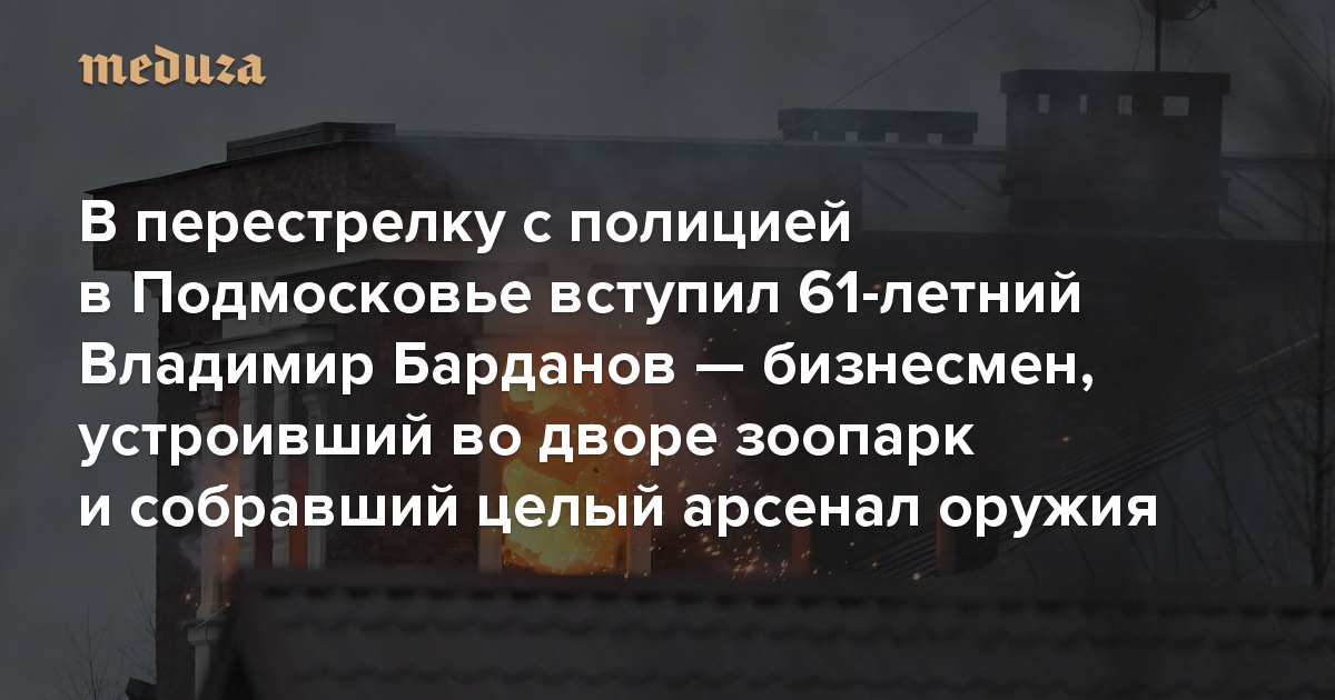 В перестрелку с полицией в Подмосковье вступил 61-летний Владимир Барданов — бизнесмен, устроивший во дворе зоопарк и собравший целый арсенал оружия В его доме нашли 30 автоматов и пистолетов, а также 20 гранат