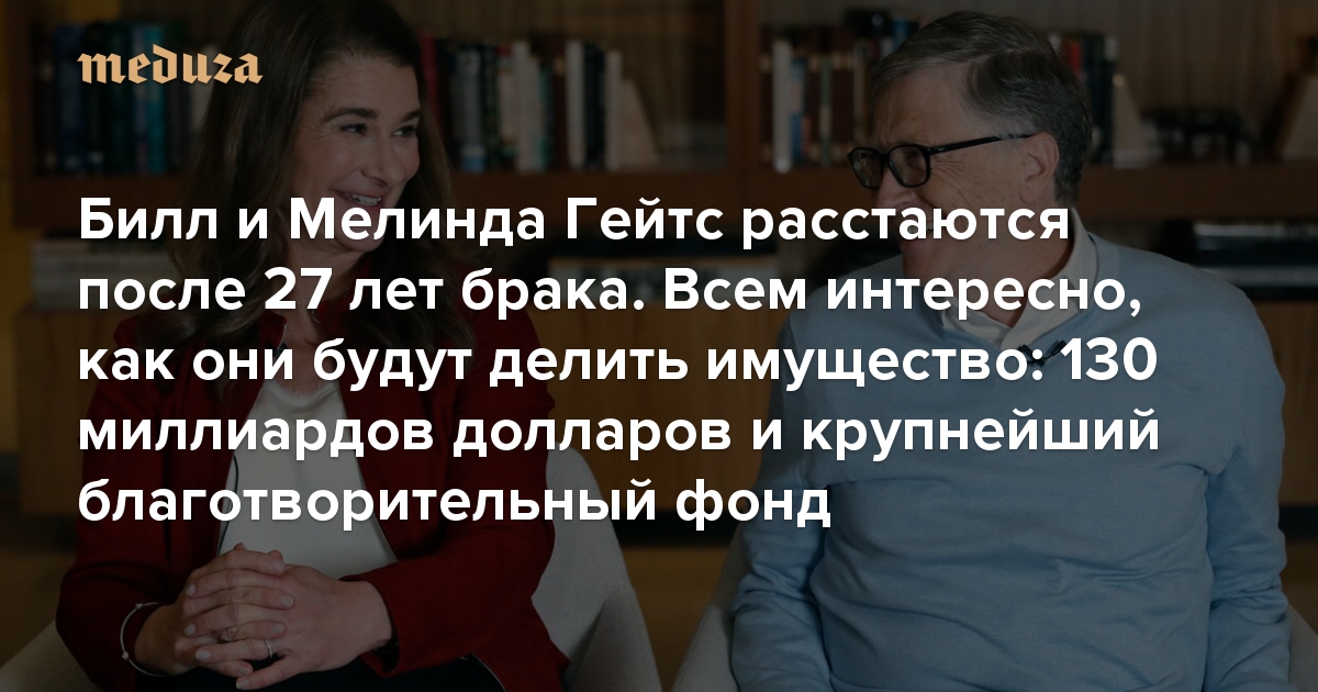 Билл и Мелинда Гейтс расстаются после 27 лет брака Всем интересно, как они будут делить имущество: 130 миллиардов долларов и крупнейший в мире благотворительный фонд