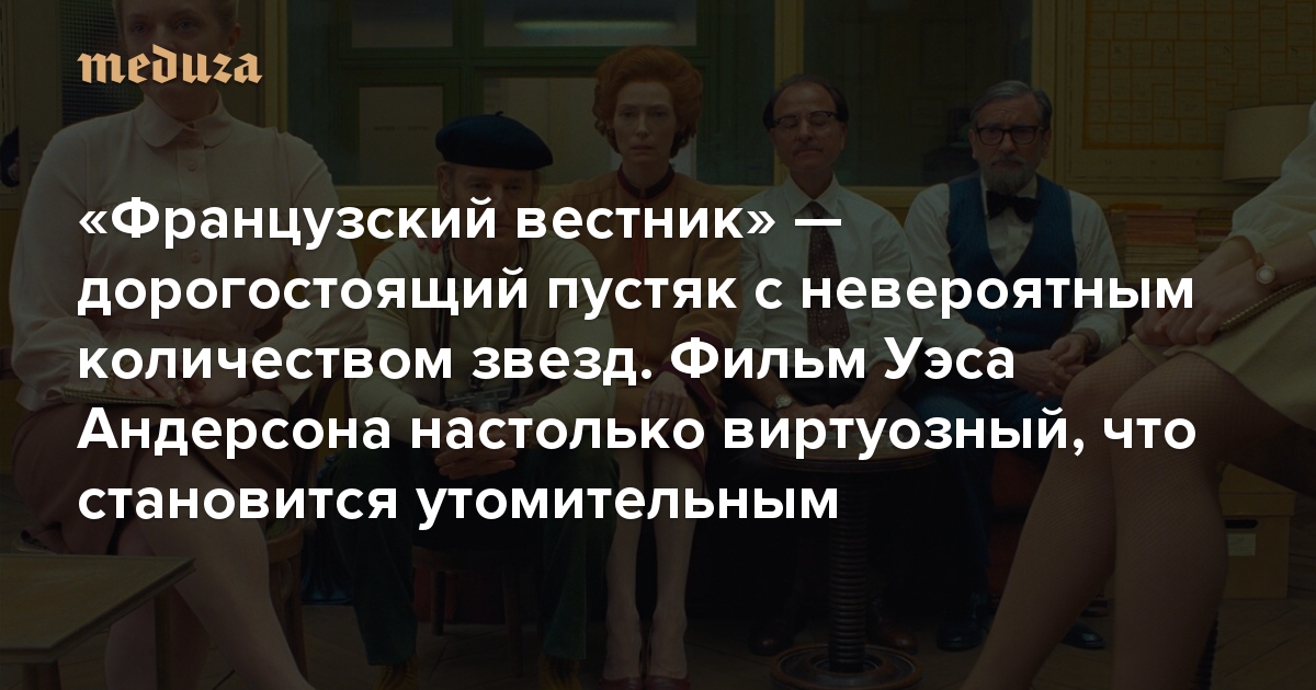 Новый фильма Уэса Андерсона «Французский вестник. Приложение к газете „Либерти. Канзас ивнинг сан“» вышел в российский прокат. Американский режиссер вновь на радость поклонникам снял виртуозно исполненную картину с ошеломляющим количеством звезд первой величины — в фильме сыграли Билл Мюррей, Оуэн Уилсон, Джеффри Райт, Тильда Суинтон, Тимоти Шаламе, Френсис Макдорманд, Леа Сейду, Бенисио дель Торо, Эдриан Броуди, Эдвард Нортон, Уиллем Дэфо, Сирша Ронан, Кристоф Вальц, Элизабет Мосс и другие. Кинокритик «Медузы» Антон Долин рассказывает о том, что из этого получилось.