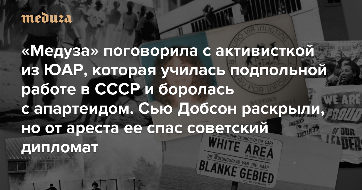Сьюзан, или Сью Добсон, сейчас 59 лет, и она живет тихой жизнью пенсионерки в британской глубинке. Но первую половину жизни она провела в родной Южной Африке, где она, представительница белого меньшинства, вступила в Африканский национальный конгресс (АНК) и помогала бороться с апартеидом. Добсон прошла обучение подпольной работе в СССР, став агентом под прикрытием: она устроилась в провластные СМИ, а затем и в государственный орган пропаганды и узнавала об операциях южноафриканских спецслужб против оппозиции в ЮАР и в других странах. В конце концов Сьюзан раскрыли, но при помощи сотрудника советского посольства ей удалось бежать. Обо всем этом Сью молчала всю жизнь: «Медуза» — второе СМИ после британского The Observer, которому Добсон рассказала историю своей жизни.