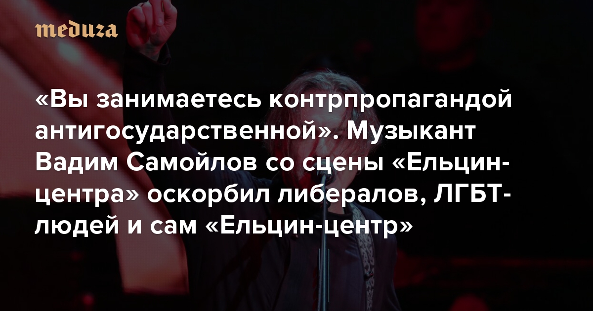 «Вы занимаетесь контрпропагандой антигосударственной». Музыкант Вадим Самойлов со сцены «Ельцин-центра» оскорбил либералов, ЛГБТ-людей и сам «Ельцин-центр» Извиняться он отказался: «то, что сказал, — то и думаю»