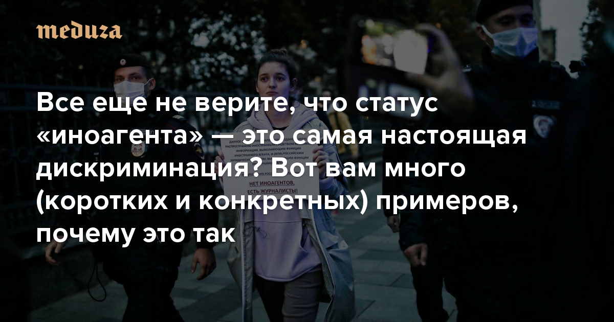 Все еще не верите, что статус «иноагента» — это самая настоящая дискриминация? Вот много (коротких и выразительных) примеров, почему это так