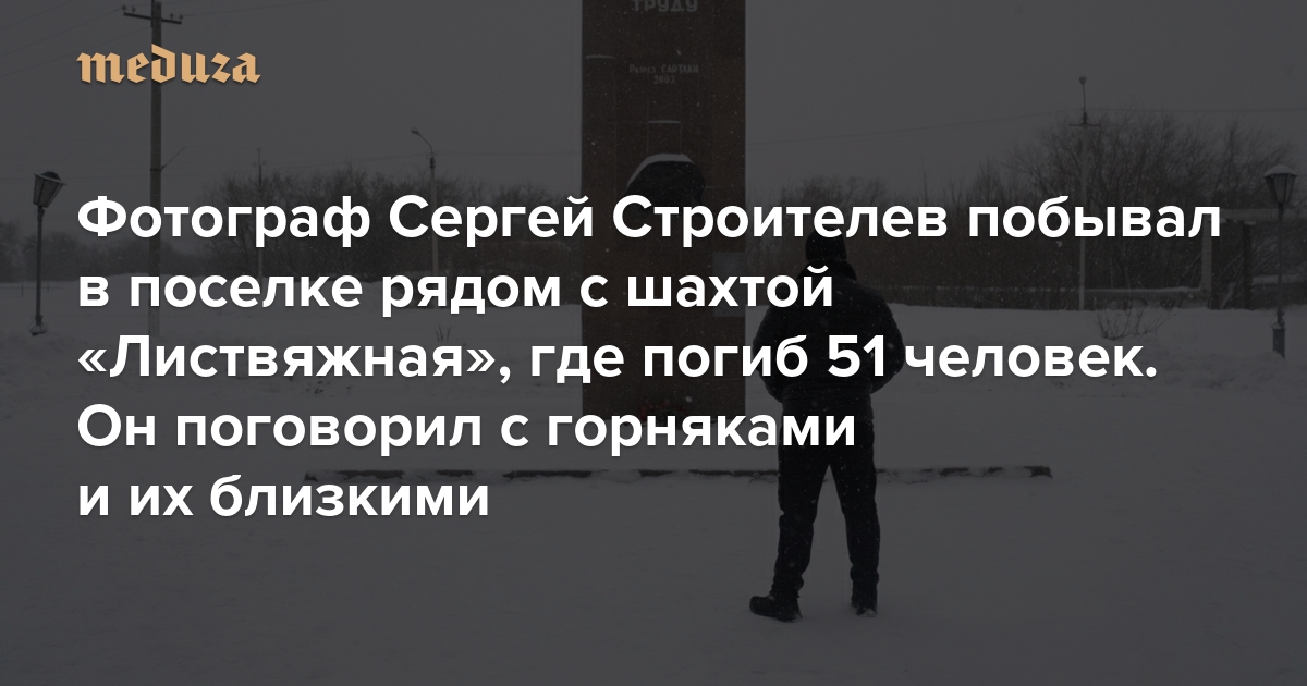 25 ноября на шахте «Листвяжная» в Кемеровской области произошел взрыв метана. Погиб 51 человек — 46 горняков и пятеро спасателей. В поселке Грамотеино, где находится шахта, сложно найти семью, не связанную с горной добычей. Люди спускаются за углем поколениями, работают целые семьи. Некоторые идут в шахту даже после того, как под землей погибли их близкие. По просьбе «Медузы» фотограф Сергей Строителев отправился в поселок. Он поговорил с шахтерами и их семьями о том, как они переживают катастрофу.