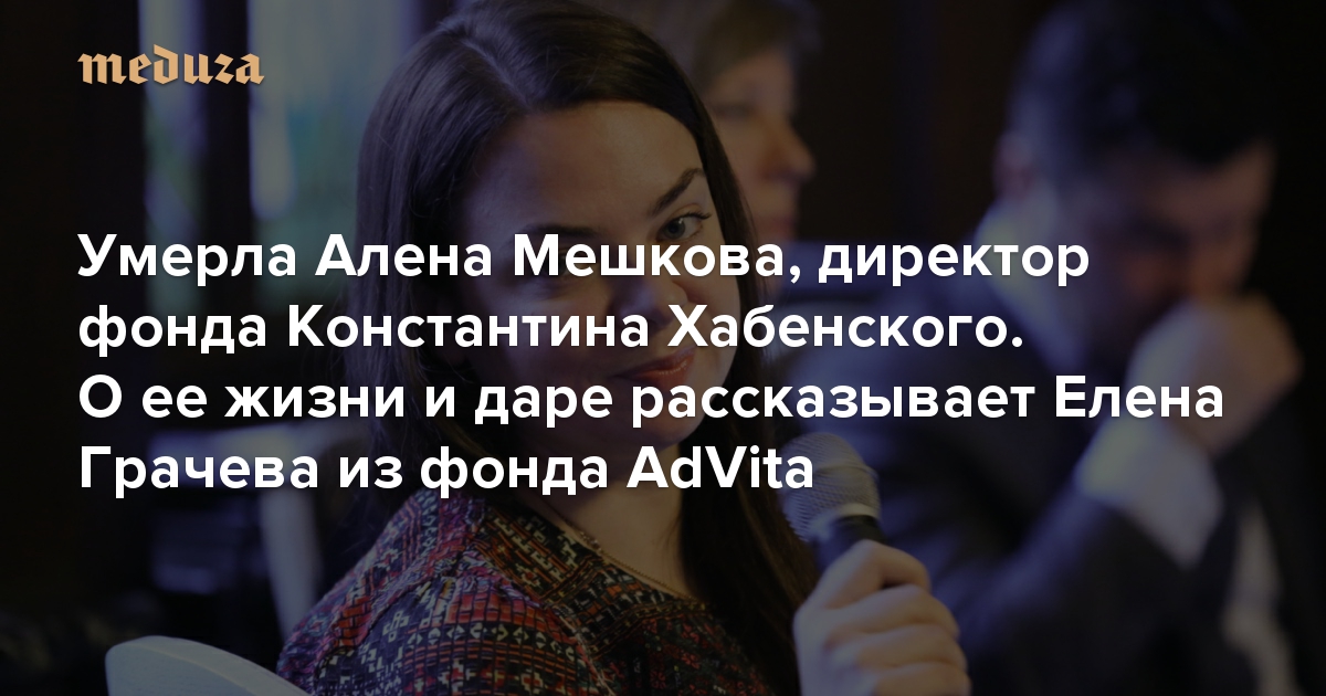 9 декабря в возрасте 44 лет умерла Алена Мешкова. С 2013-го она руководила благотворительным фондом Константина Хабенского, который помогает детям с онкологическими и другими тяжелыми заболеваниями головного и спинного мозга (до этого Мешкова работала на радио и телевидении, в оргкомитете зимних Олимпийских игр в Сочи, а также участвовала в модернизации московских парков). Более трех лет у нее самой было онкологическое заболевание. «Медуза» попросила Елену Грачеву, члена правления AdVita — другого важнейшего российского благотворительного фонда — рассказать, какой была Алена Мешкова, ее коллега и близкий по духу человек.
