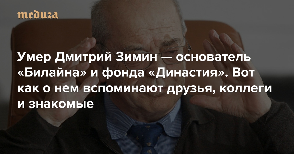 «Мы доживем до времени, когда ему будут ставить памятники» Умер Дмитрий Зимин — основатель «Билайна» и фонда «Династия». Вот как о нем вспоминают друзья, коллеги и знакомые
