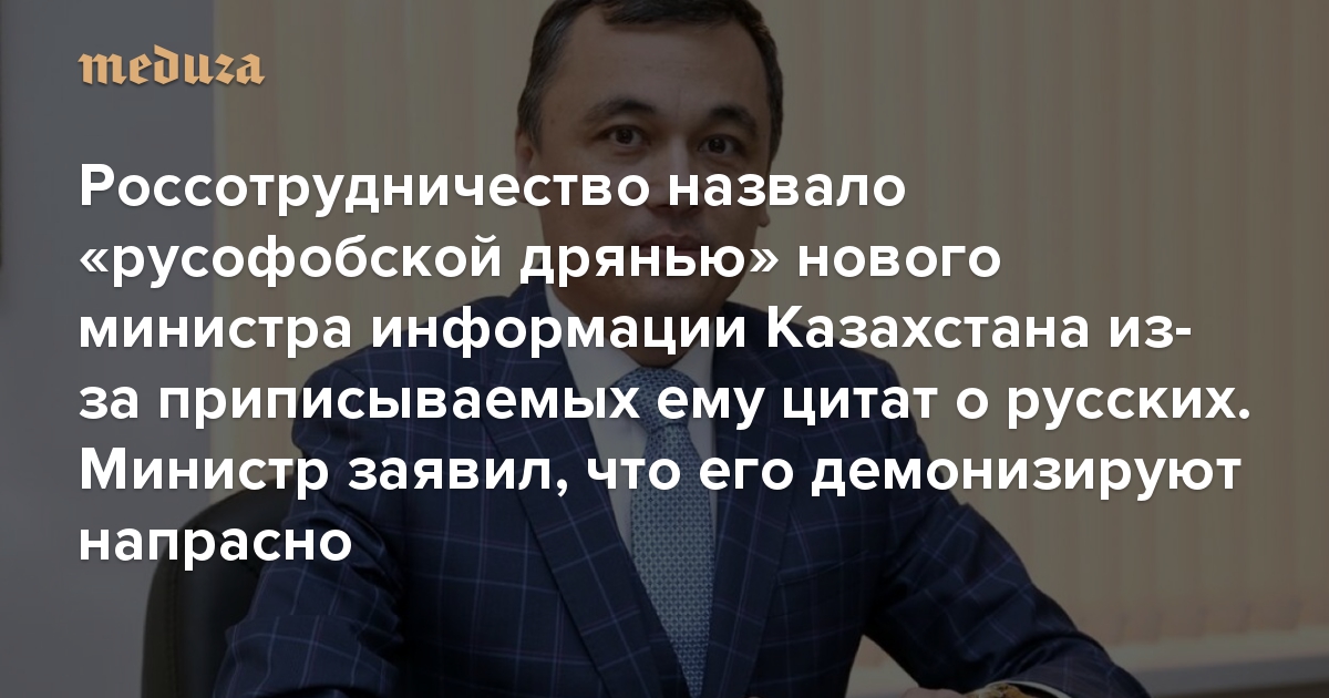 Россотрудничество назвало «русофобской дрянью» нового министра информации Казахстана из-за приписываемых ему цитат о русских Министр заявил, что его демонизируют напрасно. Однако авторство цитат опровергать не стал