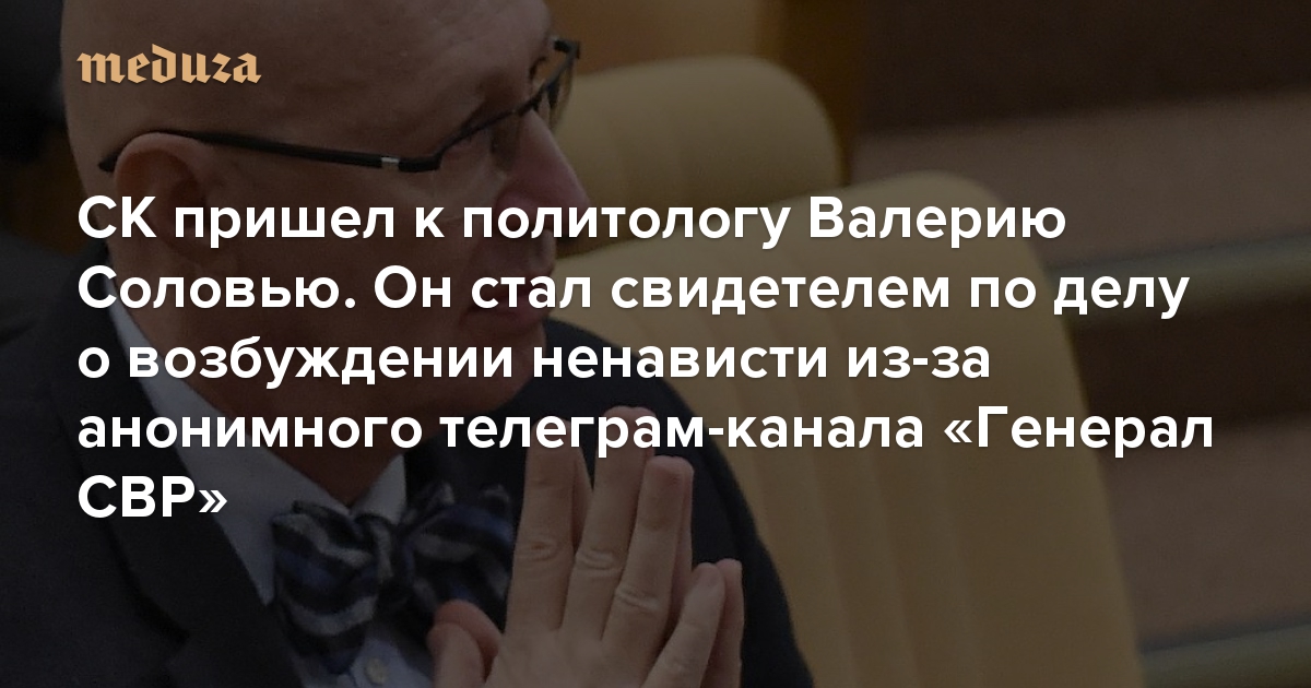 СК пришел к политологу Валерию Соловью. Он стал свидетелем по делу о возбуждении ненависти из-за анонимного телеграм-канала «Генерал СВР»