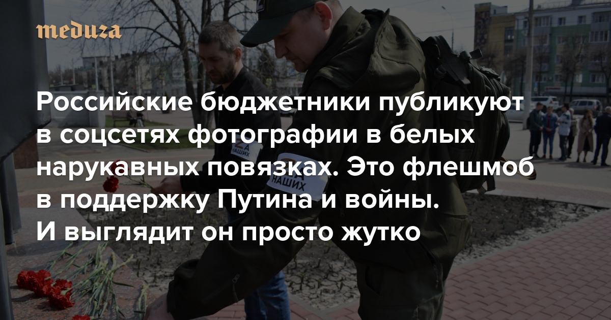 В соцсетях начался флешмоб #белаяповязка (#белаяпоVяZка) в поддержку Путина и войны. В основном в нем участвуют сотрудники бюджетных организаций — школ, детских садов, библиотек и местных органов власти. На многих снимках — дети, они тоже в белых нарукавных повязках. Участники флешмоба пишут, что белая повязка — это символ солидарности с армией и «мирными людьми, пострадавшими от рук нацбатов». Под этими людьми имеются в виду убитые мирные жители Бучи; на некоторых телах обнаружили такие повязки. При этом носить эти повязки мирных жителей заставляли российские солдаты, оккупировавшие город — а «версия» Кремля о том, что их застрелили «украинские радикалы», не выдерживает критики. «Медуза» показывает, как выглядит новый российский флешмоб в поддержку войны.