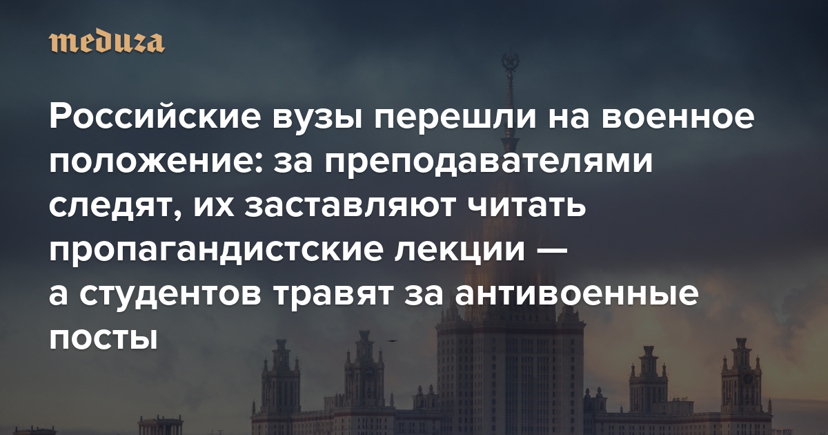 Российские вузы перешли на военное положение: за преподавателями следят, их заставляют читать пропагандистские лекции — а студентов травят за антивоенные посты Совместное исследование «Медузы» и «7×7»