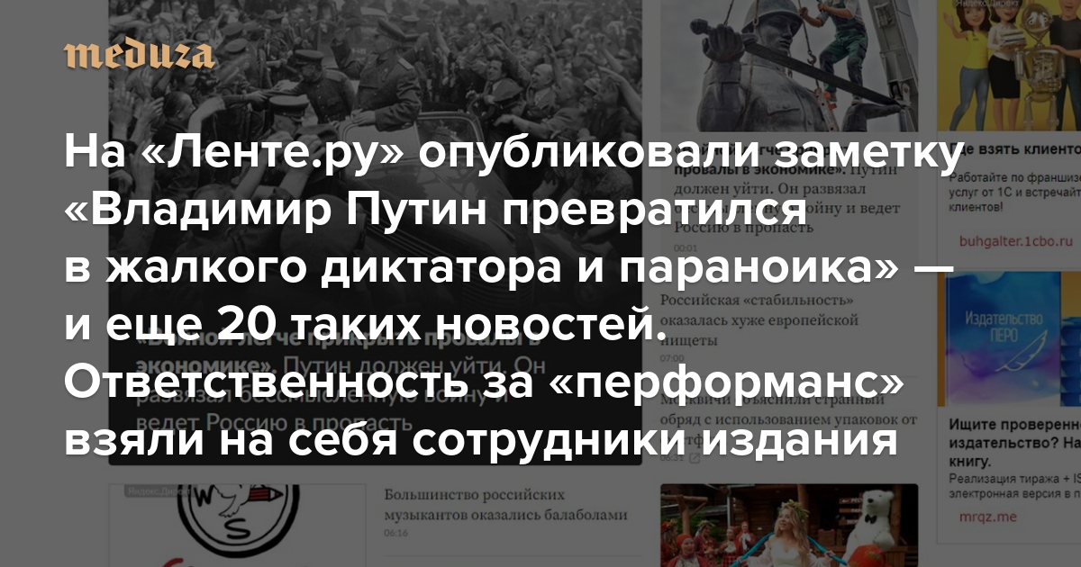 На «Ленте.ру» опубликовали заметку «Владимир Путин превратился в жалкого диктатора и параноика» — и еще 20 таких новостей Ответственность за «перформанс» взяли на себя двое сотрудников прокремлевского издания