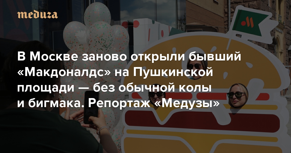 12 июня в Москве возобновили работу 15 ресторанов бывшего «Макдоналдса». Новое название бренда — «Вкусно и точка» — стало известно только за два часа до открытия главного заведения на Пушкинской площади, которое было намечено на 12 часов. В 10 утра у его дверей было немноголюдно: толпа в несколько десятков человек состояла в основном из журналистов, которые безуспешно пытались найти обычных посетителей, чтобы взять у них интервью. Через пару часов, по оценке корреспондента «Медузы», у «Макдоналдса» собралось человек до пятисот.