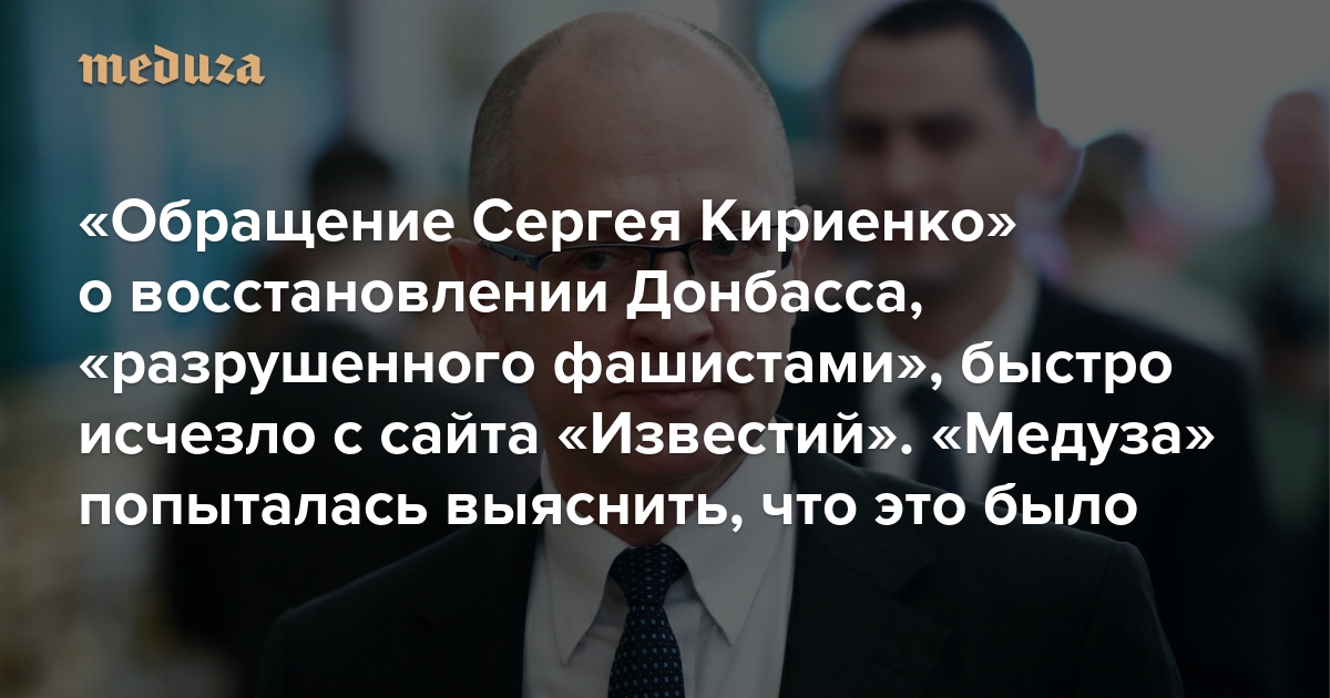 «Обращение Сергея Кириенко» о восстановлении Донбасса, «разрушенного фашистами», быстро исчезло с сайта «Известий». «Медуза» попыталась выяснить, что это было