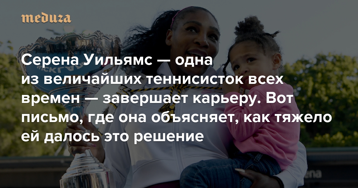 Серена Уильямс, одна из самых успешных и титулованных теннисисток в истории, объявила о скором завершении карьеры (перед этим она выступит еще как минимум на одном турнире — US Open, который пройдет в Нью-Йорке в начале сентября). Сорокалетняя спортсменка написала эссе для журнала Vogue, в котором откровенно рассказала, как тяжело ей далось решение уйти из спорта и чем она планирует заниматься дальше. «Медуза» публикует этот текст с небольшими сокращениями.