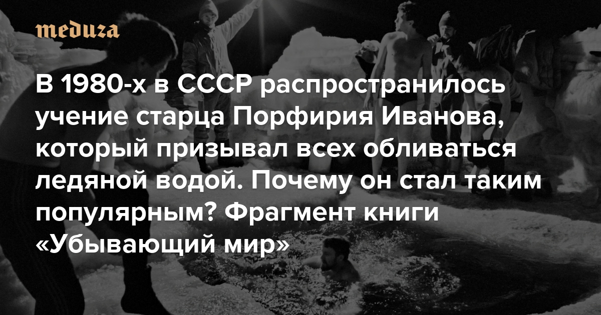 В издательстве Garage выходит книга исследователя позднесоветской культуры и литературы Алексея Конакова «Убывающий мир: история „невероятного“ в позднем СССР». Автор рассказывает о том, как люди в Советском Союзе увлекались антинаучными идеями — об экстрасенсах, внеземных цивилизациях, снежном человеке, Тунгусском метеорите и так далее (и о том, что эти интересы говорили об обществе того времени). С разрешения издательства «Медуза» публикует фрагмент книги о Порфирии Иванове, который развил движение обливания холодной водой.