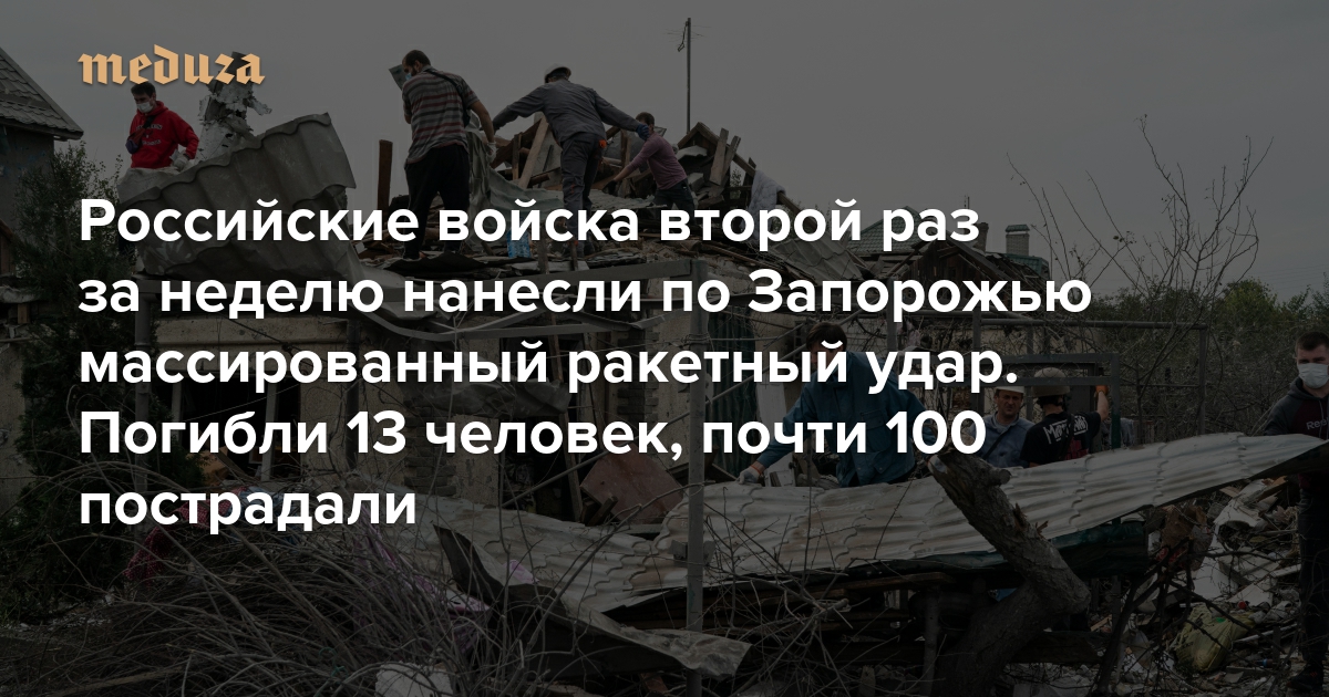 Из-за ракетного удара по Запорожью погибли 13 человек, сообщили «Громадське» в Запорожской областной военной администрации. По последним данным, еще 89 человек, в том числе 11 детей, пострадали, сообщил замглавы офиса президента Украины Кирилл Тимошенко. Больше 50 пострадавших находятся в состоянии средней тяжести.