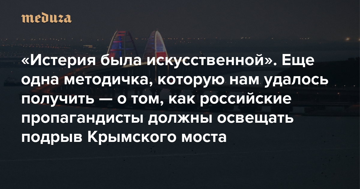 В распоряжении «Медузы» оказалась методичка, которую после подрыва Крымского моста администрация президента (АП) РФ подготовила для подконтрольных СМИ и блогеров. Авторы текста «рекомендуют» сообщать, что в результате этих событий «американский истеблишмент расколот по вопросу поддержки украинского террористического государства».