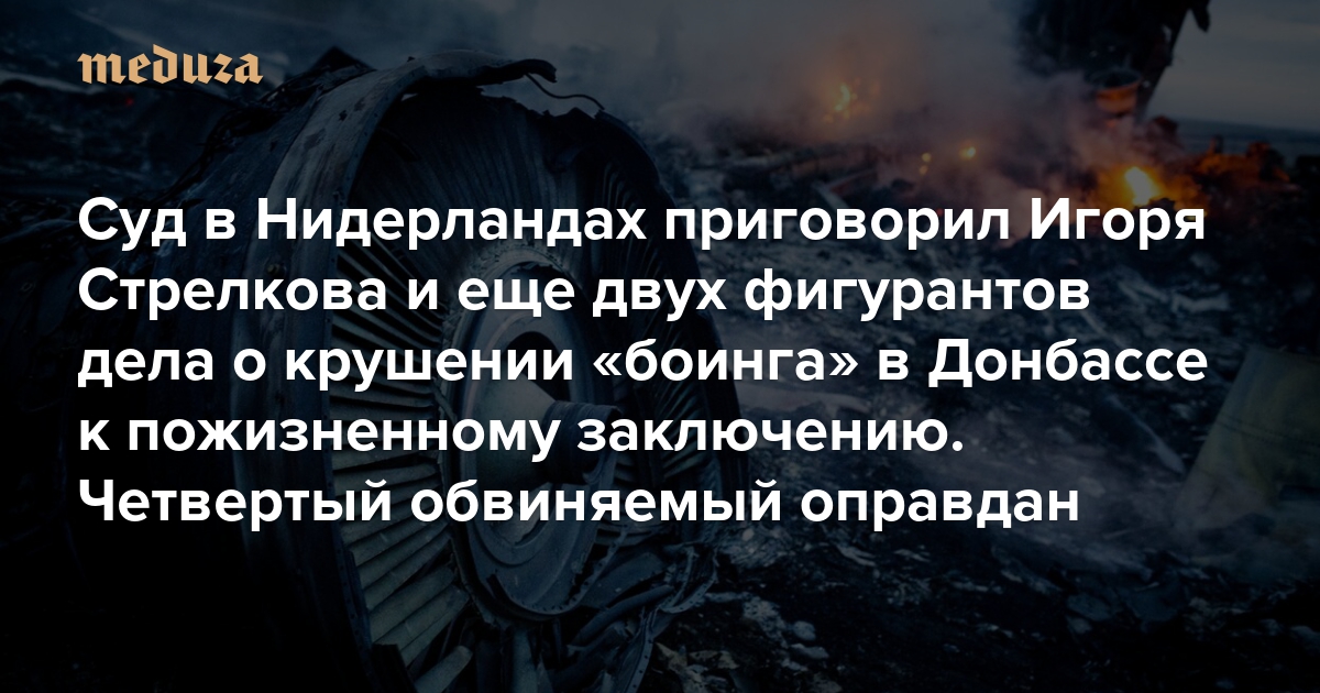 Суд в Нидерландах приговорил Игоря Стрелкова и еще двух фигурантов дела о крушении «боинга» в Донбассе к пожизненному заключению. Четвертый обвиняемый оправдан. Главное