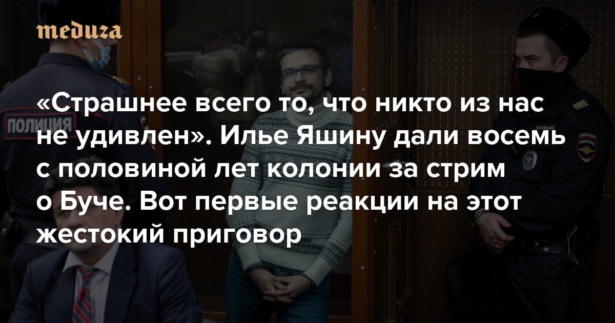 Оппозиционного политика Илью Яшина приговорили к восьми с половиной годам колонии общего режима. Мещанский суд Москвы признал его виновным в распространении «фейков» о российской армии и назначил самый длительный на данный момент срок по статье 207.3 УК РФ. Политика отправили под арест в середине июля, обвинение требовало приговорить его к девяти годам колонии из-за стрима об убийстве мирных жителей в Буче. Свою вину Яшин не признал и заявил, что приводил в стриме и позицию Украины, и позицию Минобороны России, и сообщения независимых журналистов. «Медуза» собрала первые реакции на решение суда.