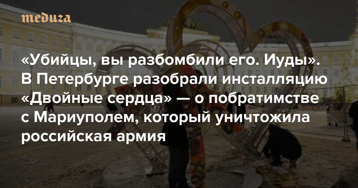 «Убийцы, вы разбомбили его. Иуды» В Петербурге разобрали инсталляцию «Двойные сердца» — о побратимстве с Мариуполем, который уничтожила российская армия. Эта инсталляция просуществовала меньше недели