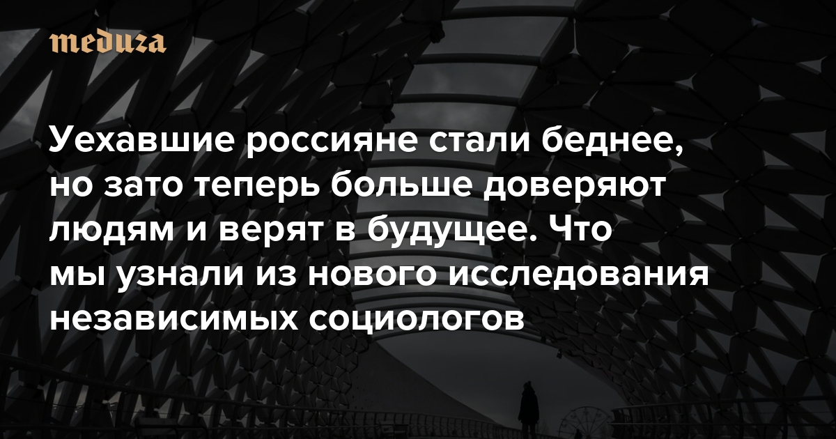 Уехавшие россияне стали беднее, но зато теперь больше доверяют людям и верят в будущее Что мы узнали из нового исследования независимых социологов, посвященного эмиграции из России после 24 февраля