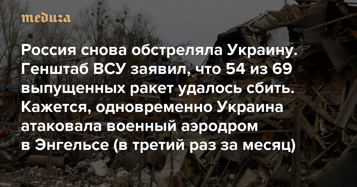 Россия снова обстреляла Украину. Генштаб ВСУ заявил, что 54 из 69 выпущенных ракет удалось сбить Кажется, одновременно Украина атаковала военный аэродром в Энгельсе (в третий раз за месяц)