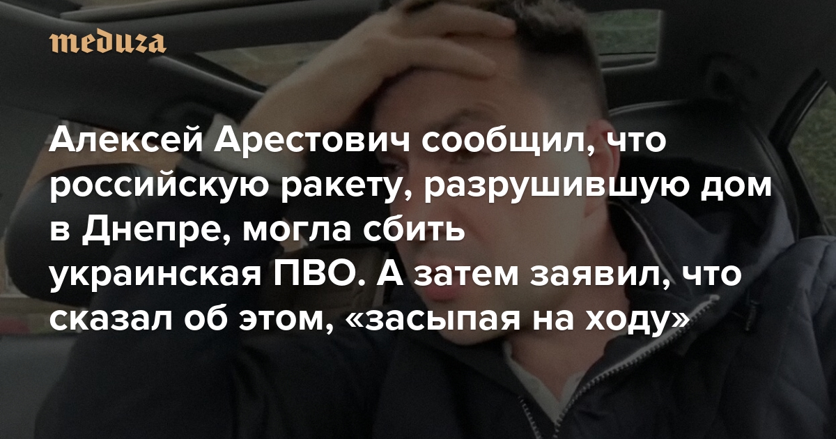 Днем 15 января Алексей Арестович выпустил новое заявление, в котором рассказал, почему сообщил о работе ПВО в Днепре в день российского удара (позднее Арестович удалил это сообщение, у «Медузы» осталась его копия). По его словам, об этом ему сообщил «товарищ, бывший пэвэошник», который в момент нападения находился на улице. «Он мне сказал, что на 100% слышал два взрыва и опознал первый как работу ПВО. До сих пор он не ошибался. И был уверен, что ракету сбили», — написал Арестович.