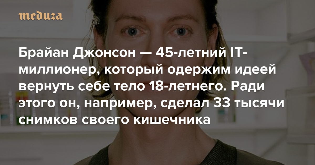 Брайан Джонсон — 45-летний IT-миллионер, который одержим идеей вернуть себе тело 18-летнего Ради этого он, например, сделал 33 тысячи снимков своего кишечника