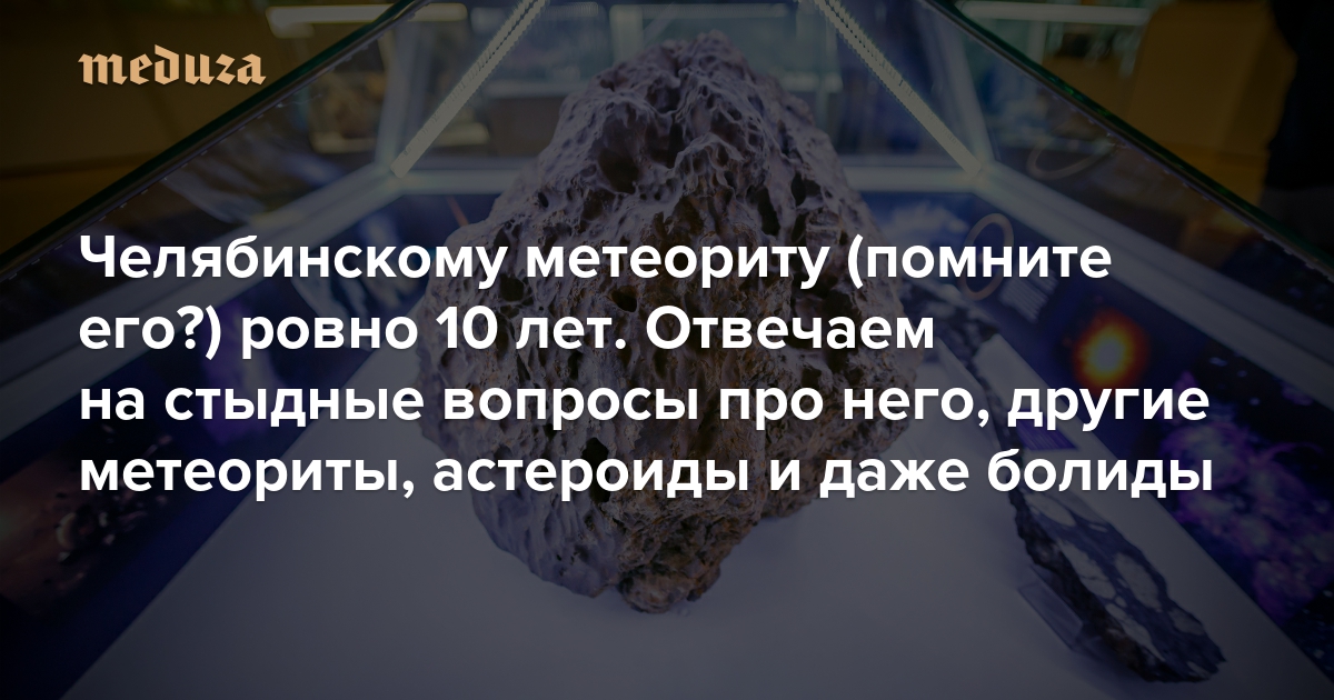 Ровно десять лет назад, 15 февраля 2013 года, яркая вспышка озарила небо над Челябинской областью — и тысячи людей стали свидетелями последних мгновений падения метеорита, фрагменты которого были позже обнаружены неподалеку от озера Чебаркуль. Благодаря многочисленным записям с видеорегистраторов, падение Челябинского метеорита стало самым задокументированным в истории. Особенно впечатлила реакция некоторых очевидцев — иногда невозмутимая до отрешенности. В результате падения никто не погиб (хотя были и разрушения, и пострадавшие люди), и это тоже способствовало тому, что о метеорите, пролетевшем над Челябинском, обычно вспоминают как о чем-то хорошем. Особенно на фоне событий следующих лет. В честь годовщины «Медуза» отвечает на стыдные вопросы про Челябинский и другие метеориты (а также про астероиды и даже болиды!)