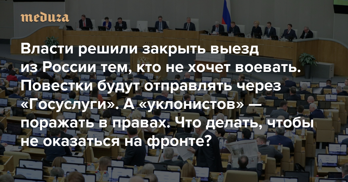 Госдума приняла пакет поправок, который очень серьезно усложнит жизнь всем, кто не собирается участвовать в войне, развязанной российскими властями. Повестки в армию теперь будут отправлять через «Госуслуги»; «гражданам, подлежащим призыву на военную службу» запретят уезжать из России; «уклонистов» будут поражать в правах (например, они не смогут получать кредиты или водить автомобиль). Кроме того, предусмотрено создание так называемого единого реестра военнообязанных: в этой гигантской базе будут хранить важнейшие персональные данные потенциальных призывников. «Медуза» поговорила с военным юристом из Коалиции российских правозащитников за сознательный отказ от военной службы — о том, что все-таки можно сделать, чтобы не оказаться на фронте.