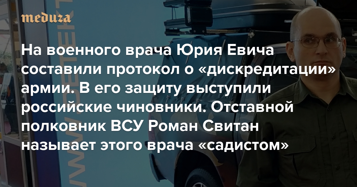 На военного врача Юрия Евича составили протокол о «дискредитации» армии. В его защиту выступили российские чиновники — и суд отказался рассматривать дело Отставной полковник ВСУ Роман Свитан называет этого врача «садистом» и «доктором Менгеле»