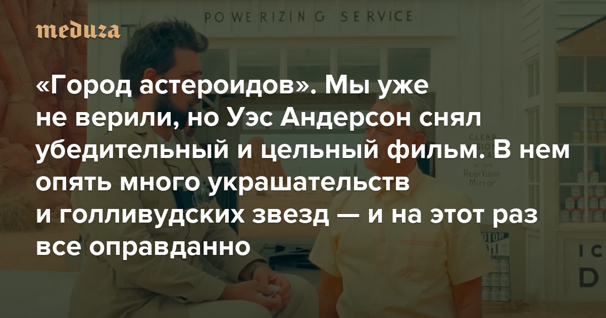В Каннах прошла премьера нового фильма Уэса Андерсона «Город астероидов». Это фильм в фильме: режиссер снимает картину о конгрессе юных астрономов. После неожиданного происшествия участники конкурса оказываются заперты в маленьком американском городе. В этой картине вновь множество голливудских звезд: Джейсон Шварцман, Скарлетт Йоханссон, Том Хэнкс, Тильда Суинтон, Брайан Крэнстон, Эдвард Нортон, Эдриан Броуди, Майя Хоук, Стив Карелл, Уиллем Дефо, Марго Робби, Джефф Голдблюм и другие. Кинокритик «Медузы» Антон Долин рассказывает, почему эта работа гораздо удачнее предыдущего «Французского вестника», который разваливался на части под весом режиссерских выдумок.