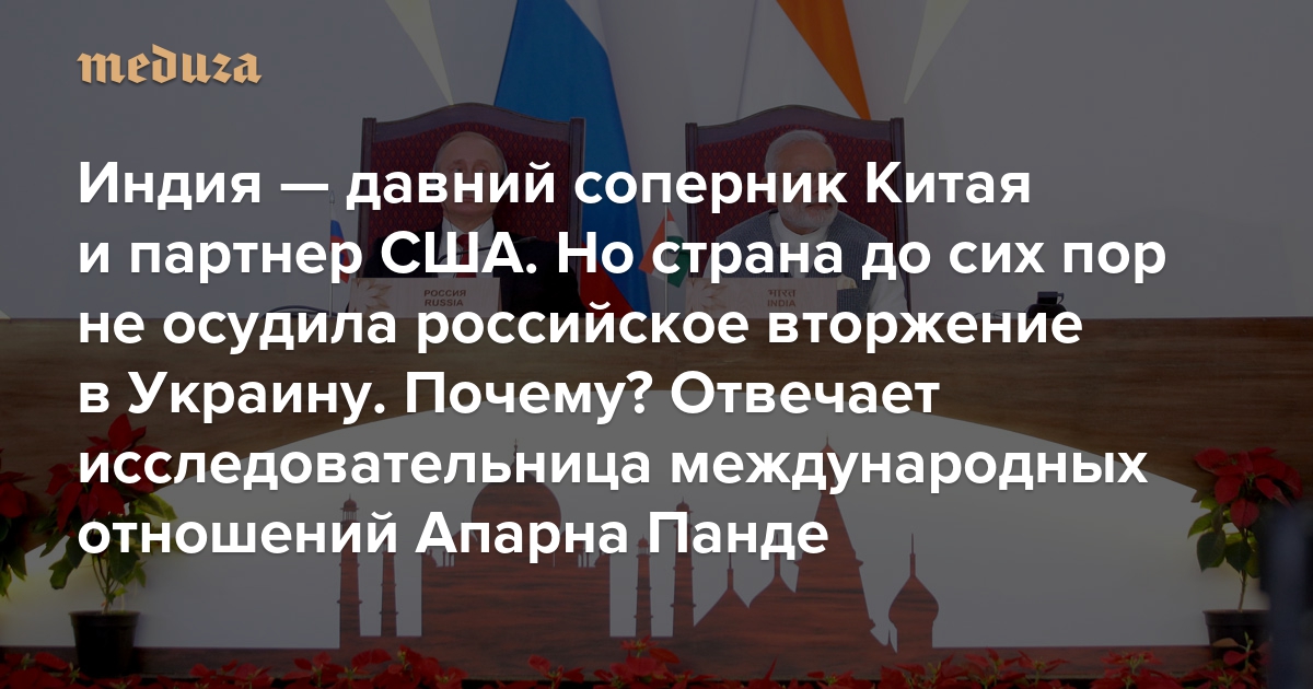 С начала полномасштабного вторжения России в Украину Индия воздерживается от голосования в ООН по резолюциям с осуждением российской агрессии. При этом страна сохраняет партнерские отношения с США, а индийские СМИ называли прошедший 2022 год «историческим для отношений между двумя старейшими и крупнейшими демократиями» из-за укрепления военного и экономического сотрудничества. «Медуза» поговорила с научным сотрудником аналитического центра Hudson Institute в Вашингтоне Апарной Панде о том, как зависимость Индии от российского оружия, соперничество с Китаем и партнерство с США влияют на ее позицию по Украине.