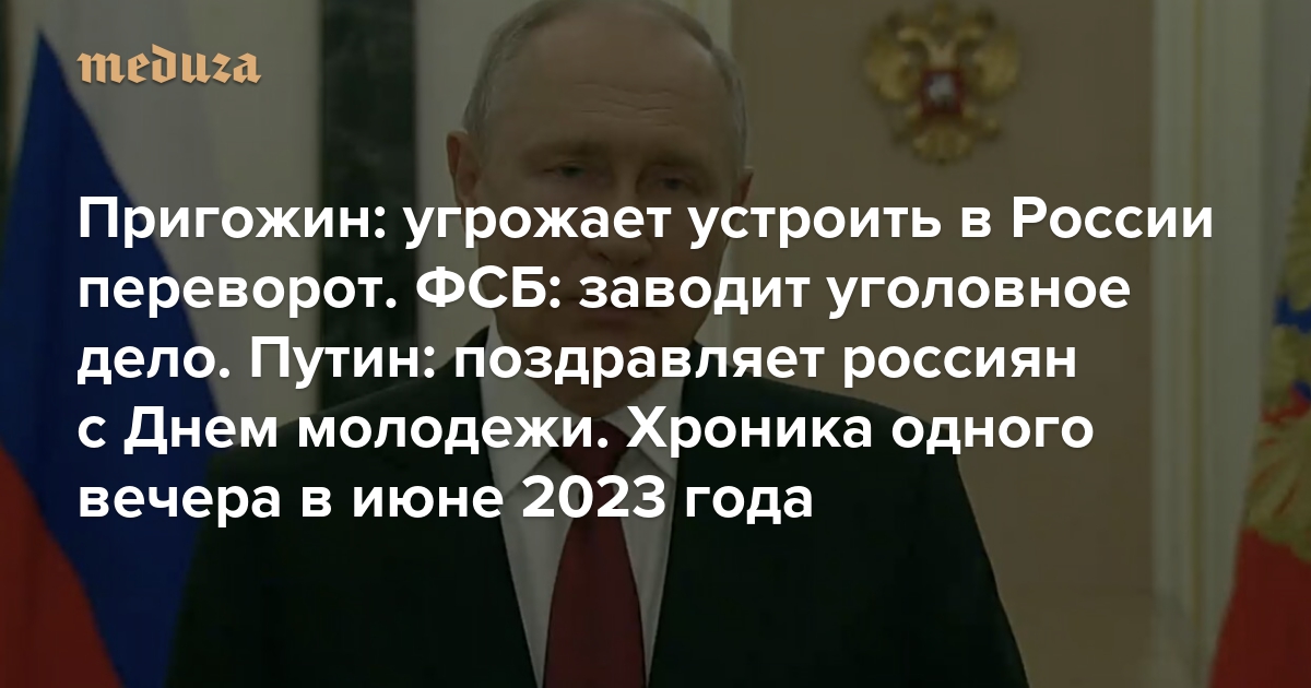 Пригожин: угрожает устроить в России переворот. ФСБ: заводит уголовное дело. Путин: поздравляет россиян с Днем молодежи Хроника одного вечера в июне 2023 года