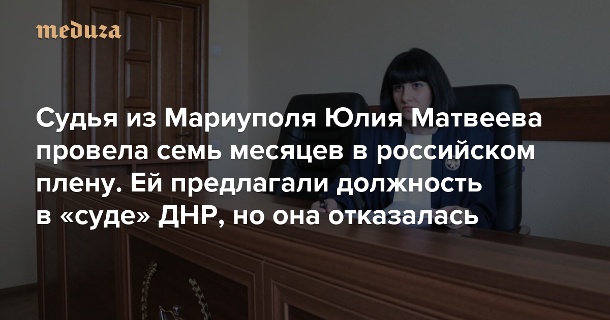 Вскоре после полномасштабного вторжения России в Украину судья из Мариуполя Юлия Матвеева попала в плен к российским военным. Там она провела семь месяцев — и все это время подвергалась физическому и психологическому насилию. В мае ей предложили должность в Верховном суде самопровозглашенной ДНР, но она отказалась — после чего ее обвинили в преступлениях против «конституционного строя и безопасности», предусматривающих наказание вплоть до смертной казни. Суд над Матвеевой должен был начаться в сентябре, но его отложили, а в октябре судью освободили в рамках обмена пленными. Издание «Ґрати» рассказало историю Матвеевой — от первых обстрелов Мариуполя до воссоединения с семьей в Киеве.