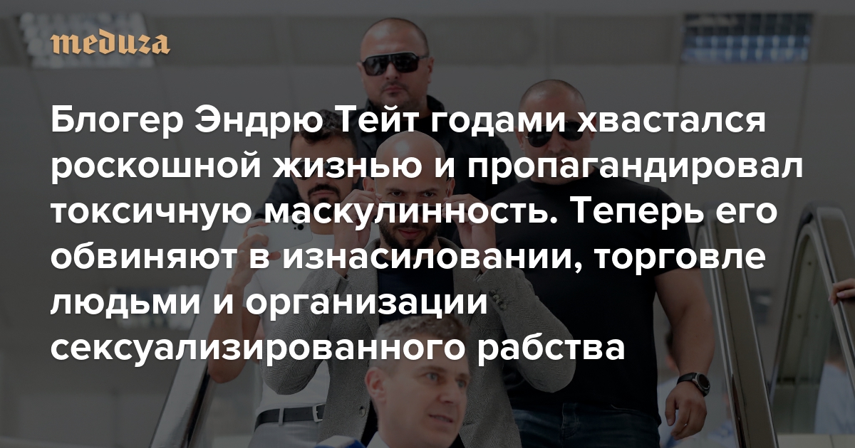 В Румынии предъявили обвинения сразу в нескольких преступлениях Эндрю Тейту — 36-летнему британо-американскому блогеру, известному женоненавистническими заявлениями и пропагандой токсичной маскулинности. Румынские следователи изучают его причастность к изнасилованию, торговле людьми и созданию преступной группировки, которая занималась сексуализированной эксплуатацией женщин. «Медуза» рассказывает о деле Эндрю Тейта, завоевавшего большую популярность и авторитет у молодых мужчин по всему миру.