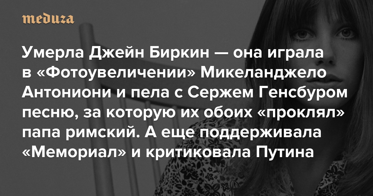 Умерла Джейн Биркин — она играла в «Фотоувеличении» Микеланджело Антониони и пела с Сержем Генсбуром песню, за которую их обоих «проклял» папа римский А еще поддерживала «Мемориал», помогала чеченским детям и критиковала Путина