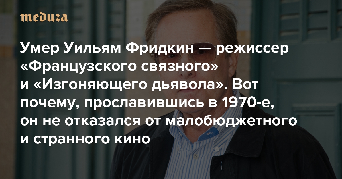 В Лос-Анджелесе 7 августа умер американский кинорежиссер Уильям Фридкин, ему было 87 лет. Фридкин считается одним из главных режиссеров Нового Голливуда, его самые известные фильмы — «Французский связной» и «Изгоняющий дьявола» (первый получил пять премий «Оскар», второй — четыре «Золотых глобуса»). Кинокритик «Медузы» Антон Долин рассказывает, почему стоит обратить внимание на другие его картины, в том числе те, которые проваливались в прокате и получали антипремию «Золотая малина».