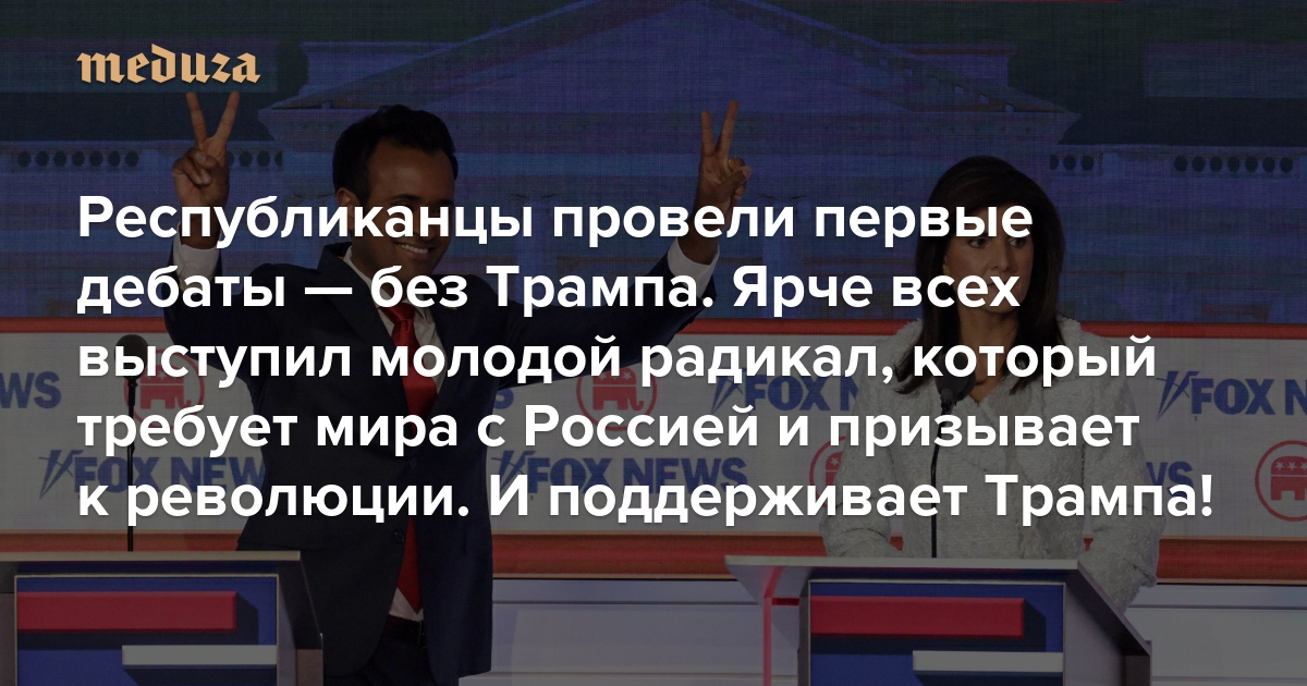 Республиканцы провели первые дебаты — без Трампа Ярче всех выступил молодой радикал, который требует мира с Россией и призывает к революции. И поддерживает кого? Конечно, Трампа!