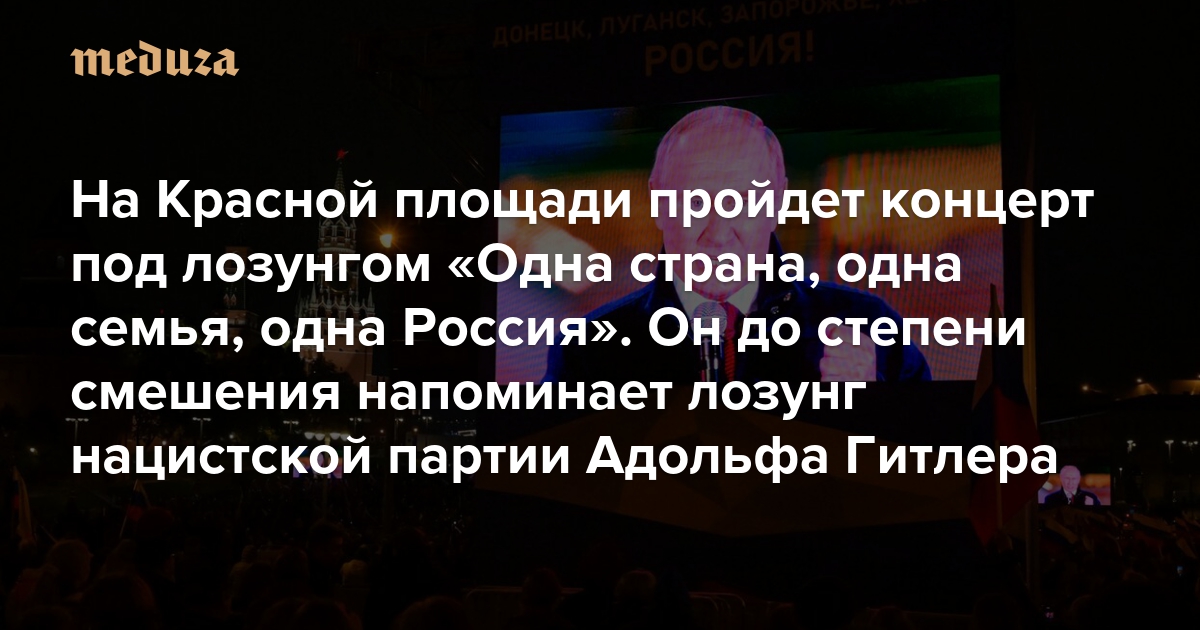 На Красной площади пройдет концерт в честь годовщины аннексии украинских территорий. Под лозунгом «Одна страна, одна семья, одна Россия» Он до степени смешения напоминает лозунг нацистской партии Адольфа Гитлера