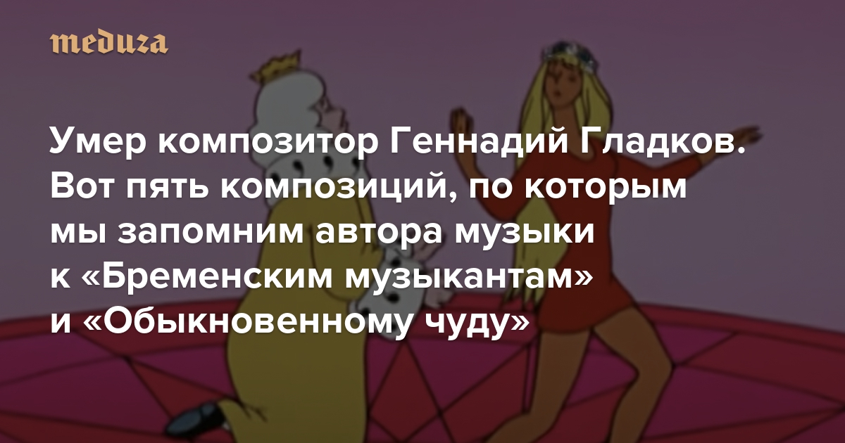 Советский и российский композитор, народный артист России Геннадий Гладков умер в возрасте 88 лет. В 1969 году вышел мультфильм «Бременские музыканты» с музыкой Гладкова, которая принесла ему всесоюзную известность. В продолжении, «По следам бременских музыкантов», он сам спел партию Глупого короля. Еще Гладков написал музыку к анимационным фильмам «Малыш и Карлсон», «Голубой щенок», «Как львенок и черепаха пели песню», «Ну, погоди!». В полнометражном игровом кино его самые известные работы — «Джентльмены удачи», «Человек с бульвара Капуцинов», «12 стульев», «Обыкновенное чудо». «Медуза» выбрала несколько работ Гладкова, которые позволяют услышать его музыку с нетривиальной стороны.