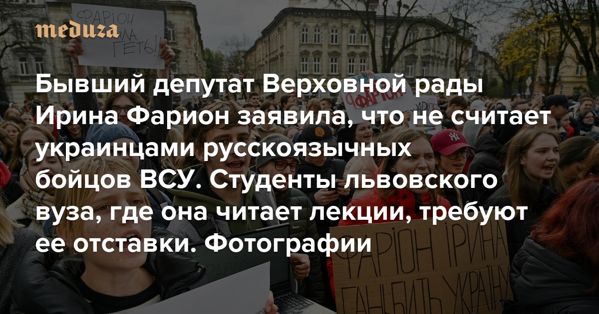 Ирина Фарион — бывший депутат Верховной рады (2012–2014) и доктор филологических наук. Поводом для студенческого протеста во Львове послужило интервью Фарион, в котором она заявила, что не считает русскоязычных военнослужащих ВСУ украинцами. Кроме того, Фарион опубликовала в своем телеграм-канале письмо студента из Крыма Максима Глебова, поддержавшего ее позицию. Она не скрыла его данные, из-за чего студента задержали российские правоохранительные органы. СБУ возбудила уголовное дело против Фарион.