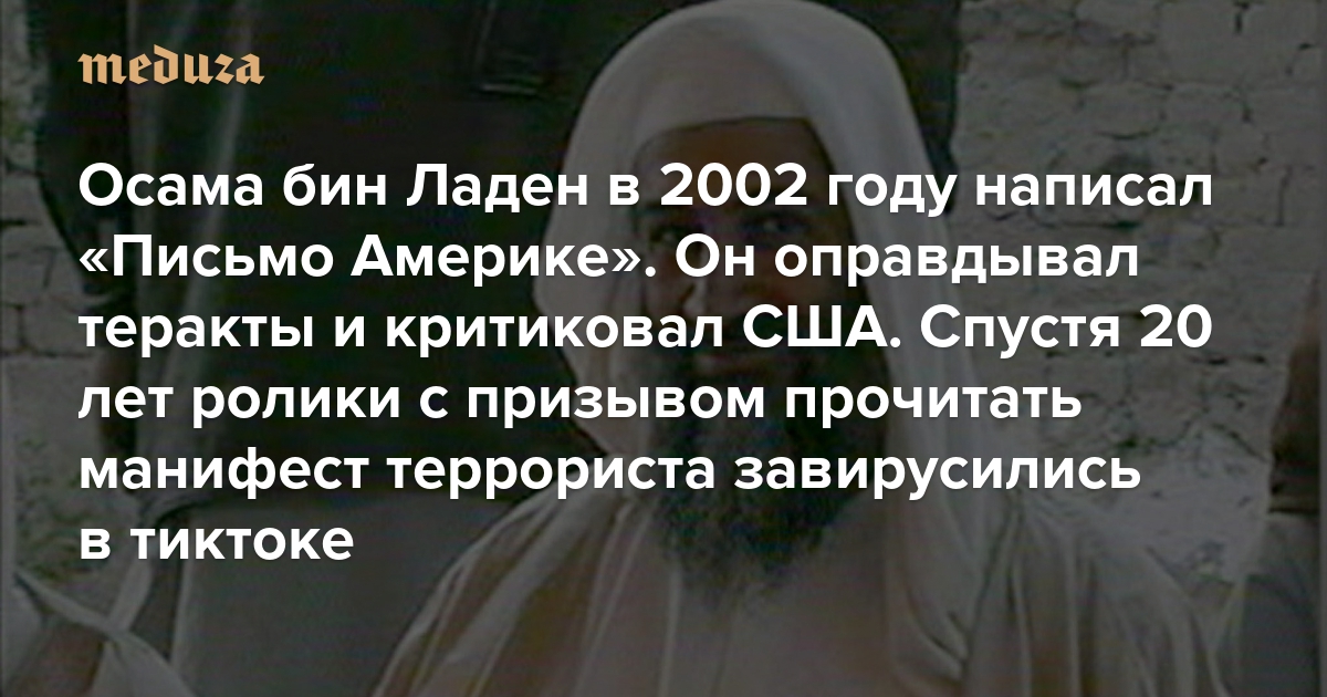 Осама бин Ладен в 2002 году написал «Письмо Америке». Он оправдывал теракты и критиковал США — в том числе за поддержку Израиля Спустя 20 лет ролики с призывом прочитать манифест террориста завирусились в тиктоке