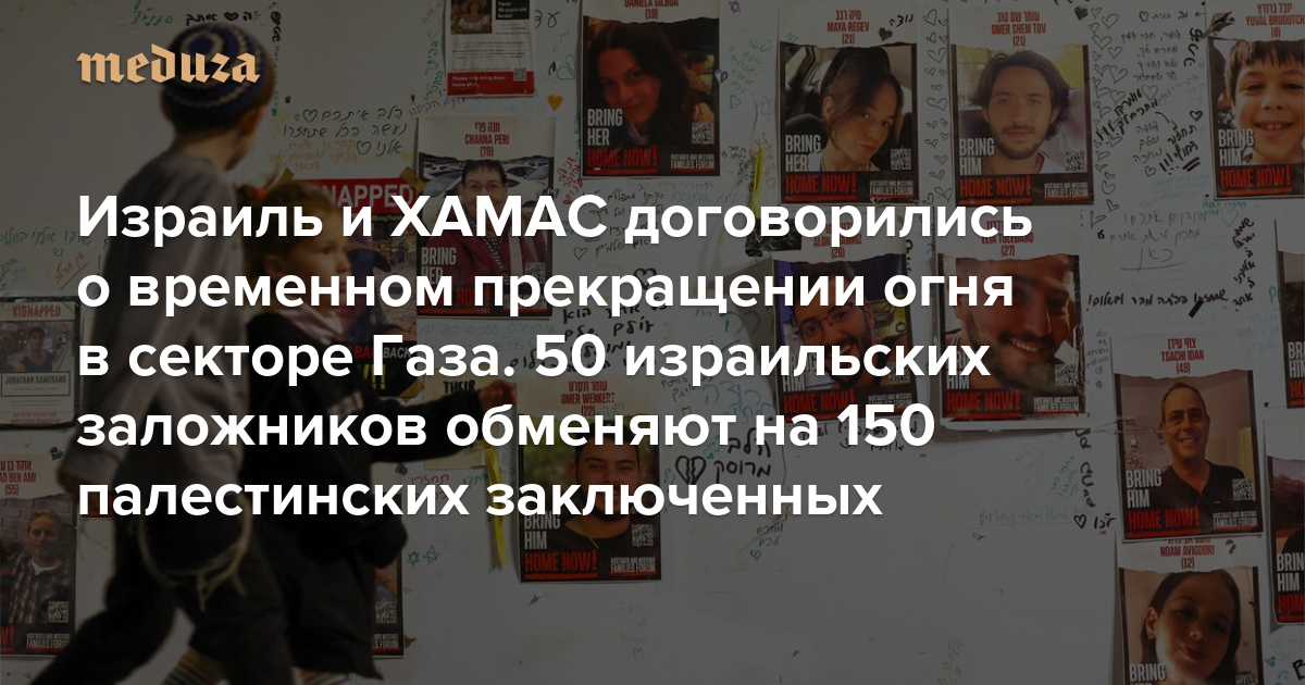 В ночь на 22 ноября правительство Израиля утвердило параметры сделки о гуманитарной паузе в секторе Газа и освобождении заложников, захваченных в плен боевиками ХАМАС 7 октября. Факт заключения соглашения также подтвердили представители палестинского движения в одном из своих телеграм-каналов. В рамках сделки ХАМАС освободит 50 заложников в обмен на 150 палестинцев, находящихся в израильских тюрьмах, а в Газе будет установлен четырехдневный режим прекращения огня. «Медуза» рассказывает главное об этом соглашении.
