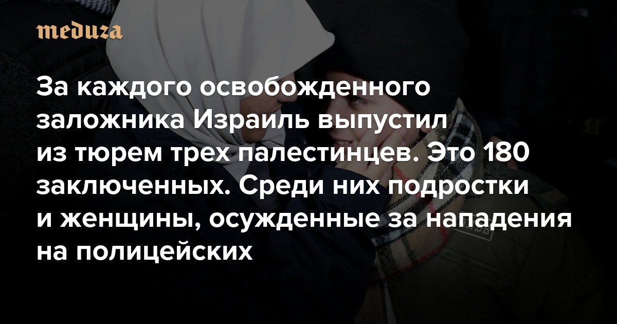 За пять дней перемирия Израиль в рамках сделки с ХАМАС освободил из тюрем 180 палестинских заключенных — по три человека за каждого израильского заложника, отпущенного из плена боевиками. Сверх договоренностей террористы также отпустили одного россиянина, одного филиппинца и 19 граждан Таиланда. Согласно последним данным пресс-службы правительства Израиля, в плену у ХАМАС остается еще 161 человек, 60 уже на свободе. Израиль выпустил из тюрем в основном женщин и подростков (многих из них задержали недавно и еще не предъявляли обвинений), но также и осужденных, в том числе за нападение с ножом или покушение на убийство. «Медуза» рассказывает, кто из палестинцев оказался на свободе и в чем их обвиняли.