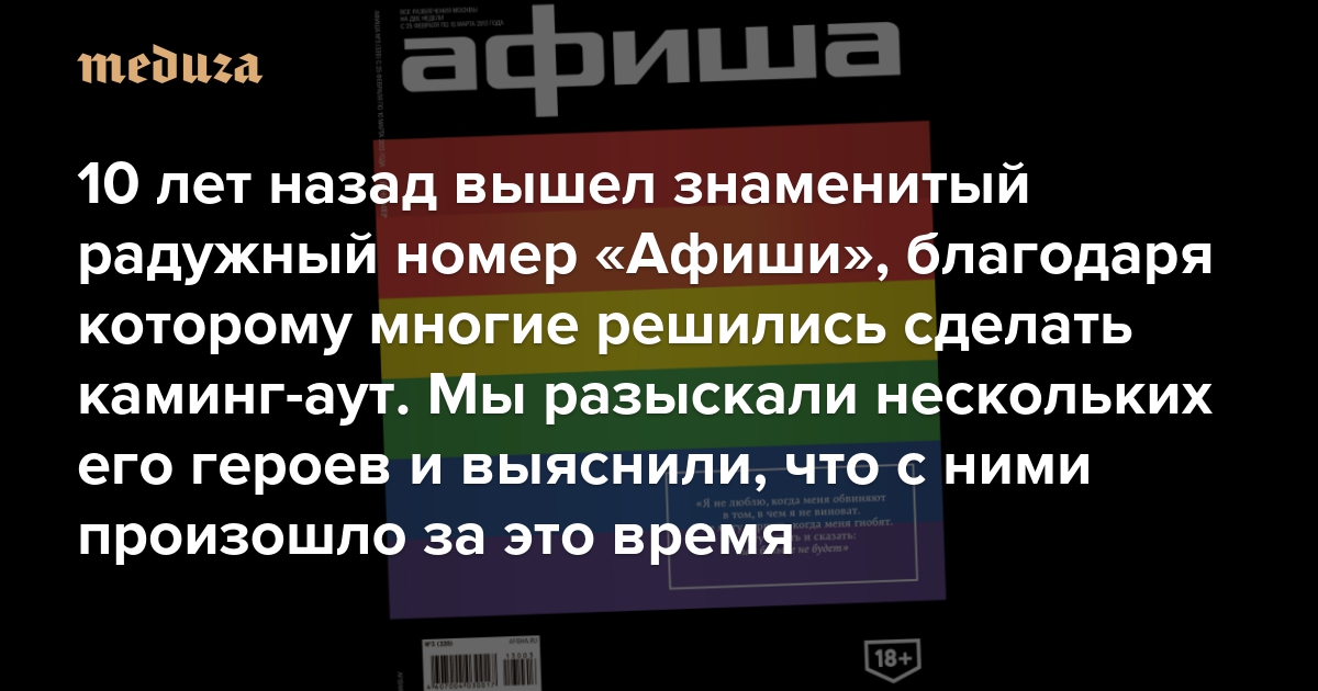 10 лет назад вышел знаменитый радужный номер «Афиши», благодаря которому многие решились сделать каминг-аут Мы разыскали нескольких его героев и выяснили, что с ними произошло за это время