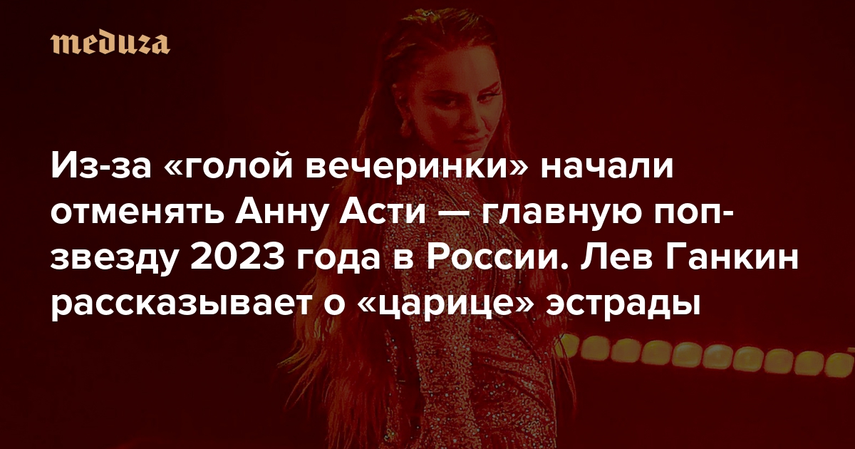 Одной из суперзвезд, попавших под волну отмен после «голой вечеринки» Насти Ивлеевой, внезапно стала Анна Асти — главная эстрадная артистка года в России. После ее выступления в Мутаборе площадки начали убирать ее с афиш (отменены выступления в клубе Gipsy и на мероприятии «Новый год в Барвихе»), онлайн-кинотеатр Kion перенес премьеру фильма-концерта о певице. Еще месяц назад такое было сложно представить: в 2023-м Асти собрала в своем российском туре несколько многотысячных площадок, ее последний альбом «Царица» прочно обосновался в чартах, а Филипп Киркоров (тоже посетивший вечеринку и извинившийся за это) называл исполнительницу «номером один» среди конкурентов. Она родилась в Черкассах — но почти за два года войны с Украиной ни разу не высказывалась о ней; недавно Асти получила российское гражданство — но из-за выступления у Ивлеевой его теперь просят аннулировать. По просьбе «Медузы» о феномене популярности Анны Асти рассказывает музыкальный критик Лев Ганкин.